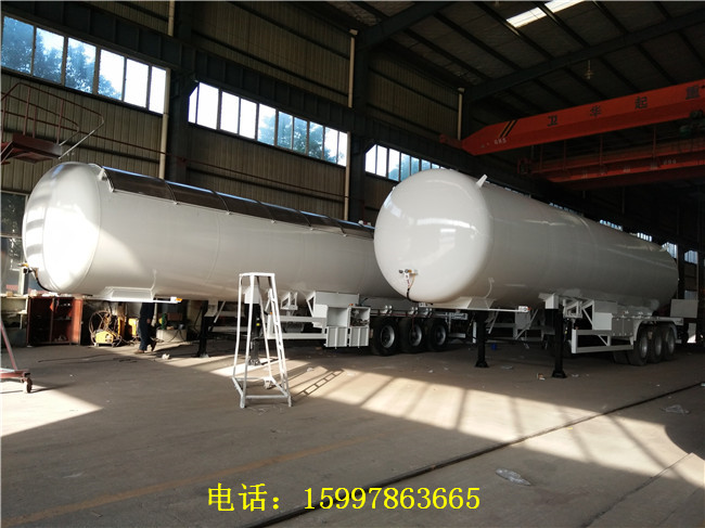 液化氣半掛車是由罐體和行走機構(gòu)組成,通常用來運輸液化石油氣體如丙烯、丙烷、液氨、二甲醚、異丁烷、氯甲烷等。