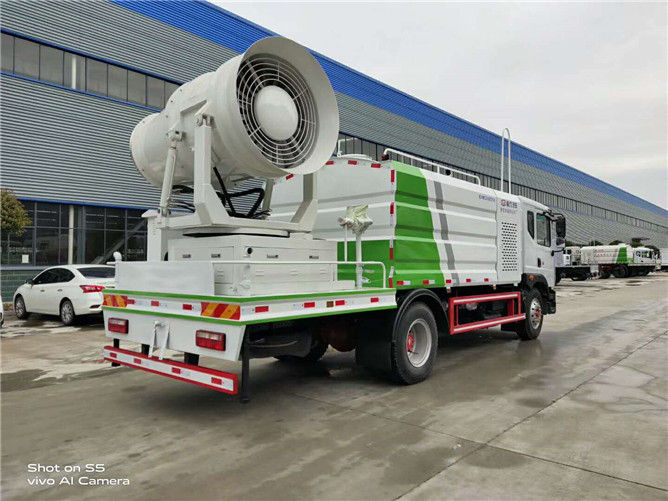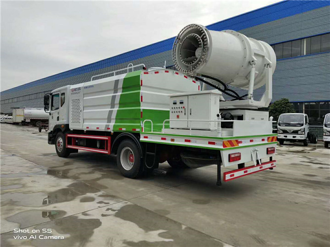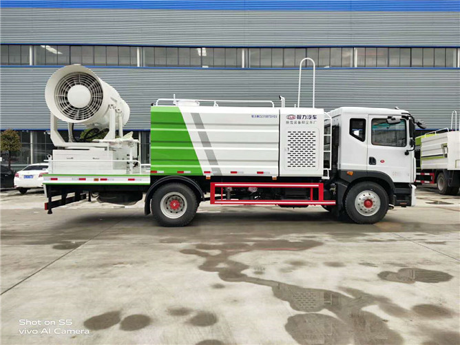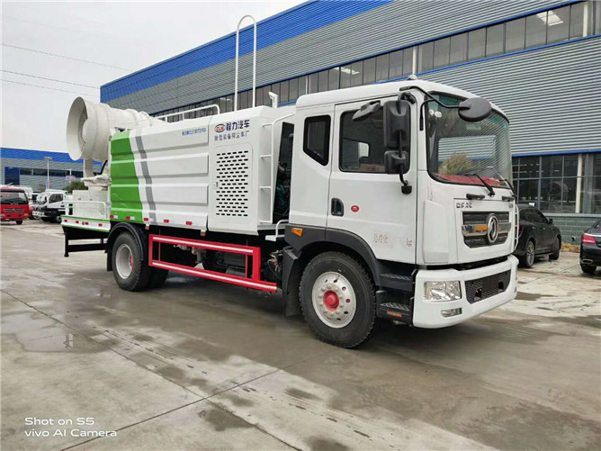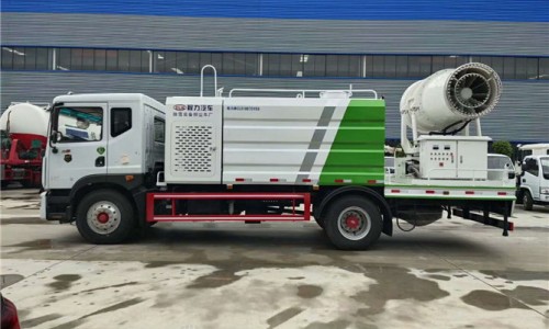東風D9抑塵車配備前沖、后灑、側(cè)噴(均采用6個T型球閥駕駛室自動操作控制)高炮、加大工作平臺,前置卷簾門消音發(fā)電機倉,中置加大容量方型水箱,罐體滿載容積10立方,是一款配置不錯的環(huán)衛(wèi)車。