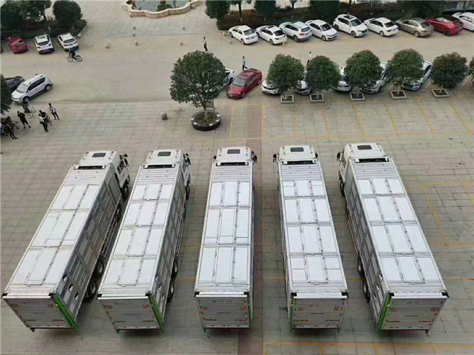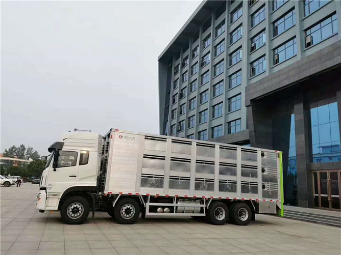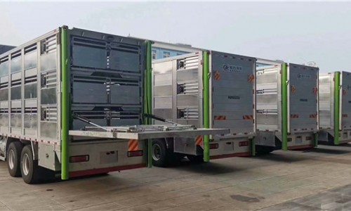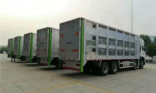 畜禽運輸車箱體采用全鋁合金制作,主要規(guī)格有東風(fēng)天錦全鋁合金運豬車(三層成豬70~75頭,四層幼豬750~800頭)和東風(fēng)天龍前四后八全鋁合金運豬車(三層成豬110~120頭,四層幼豬1200~1250頭)。該種車型標(biāo)配噴淋、喂食、監(jiān)控、混合隔倉、垂直升降尾板、保溫機組,減少臟亂差,細(xì)菌飛散,保護環(huán)境,增加成活率。
