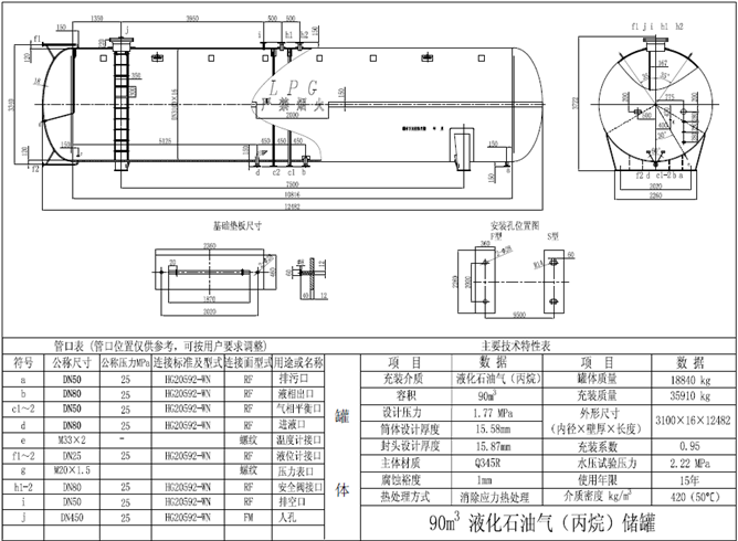 90立方液化氣儲罐一般多設(shè)計成直徑3100mm,設(shè)計壓力為1.77MPa,封頭為橢圓形,主體材料為壓力容器產(chǎn)品專用鋼板——容器板Q345R,罐體上鞍座和接管的位置可按用戶的要求進行調(diào)整,以下為大眾的90方規(guī)格參數(shù),供大家參考。
