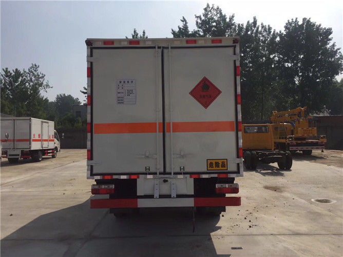 我公司生產(chǎn)的氣瓶運(yùn)輸車廂體為雙層金屬結(jié)構(gòu),廂體尾部雙開(kāi)門,外板采用靜電屏蔽冷軋鋼板,中間填充B1級(jí)阻燃泡沫,內(nèi)飾為鋁板。廂體上側(cè)安裝防雨通風(fēng)透氣孔。底板為花紋板,上鋪防靜電膠皮,廂內(nèi)兩側(cè)加裝固定貨物臥環(huán),門框帶防盜報(bào)警器,頂部帶氣味報(bào)警器,底盤上裝有兩條拖地導(dǎo)靜電膠帶,廂體外側(cè)安裝示廓標(biāo)記燈以及手提滅火器等安全裝置(選裝隔板、側(cè)門)。
