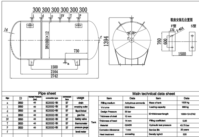 此臺(tái)液氨儲(chǔ)罐為烏茲別克斯坦一化工廠所需,按其要求,設(shè)計(jì)壓力為3.5MPa,直徑為2000mm,我公司技術(shù)員為其量身定制方案圖紙,采用Q345R材質(zhì),罐體設(shè)置有安全閥、溫度計(jì)、壓力表、液位計(jì)等接口。