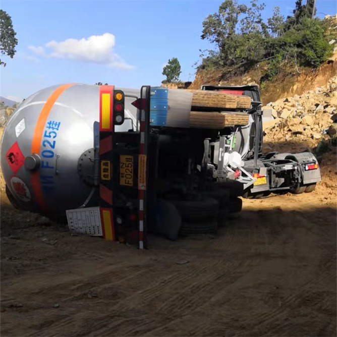 61.9立方液化氣半掛車是目前國(guó)內(nèi)市場(chǎng)上使用狀況較好的一款液化氣運(yùn)輸車,配置較為高端,采用HW590E材質(zhì)制作,配置氣囊橋,側(cè)防護(hù)欄和工具箱、閥門(mén)箱均為鋁合金材質(zhì)。由于液化氣半掛車常年在路上運(yùn)輸液化氣介質(zhì),難免會(huì)發(fā)生事故,那么,若發(fā)生側(cè)翻或碰撞事故,該如何處理呢?