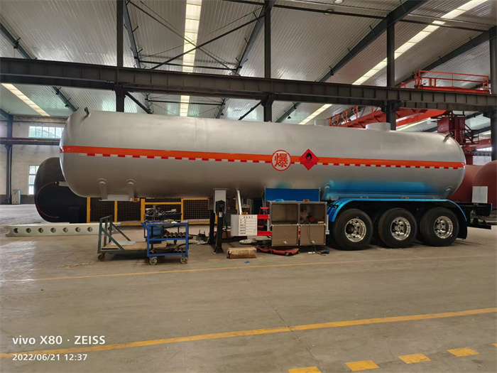 此款三軸氯甲烷半掛車總質(zhì)量40噸,額定載荷29970kg,外形尺寸12150×2550×3850mm,采用16MnDR材質(zhì)制作,筒體厚度8mm,封頭厚度10mm,配置BPW空氣懸掛,雙錢真空胎,鋁合金鋼圈,氣相接口為DN25,液相接口為DN50,兩側(cè)均設(shè)有自流口,便于裝卸作業(yè)。