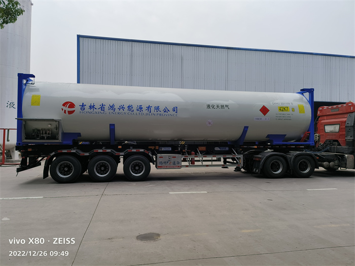 如圖所示,兩臺40英尺LNG罐式集裝箱上噴有吉林能源公司的名稱,經(jīng)過認證,可在國內(nèi)進行運輸作業(yè)。