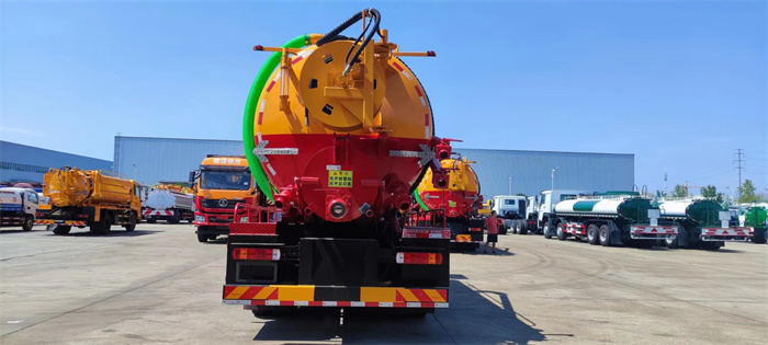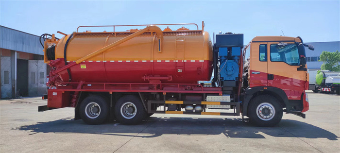 該車搭載TX-M駕駛室,配置國六350馬力發(fā)動機(jī),HW19710變速箱,10擋變速箱,帶空調(diào)。一體罐22方,其中水罐5.5方,污罐16.5方,罐體厚8毫米,封頭厚8毫米,罐體可舉升,通潔350流量高壓泵,高壓泵加裝大過濾杯,卷盤加大帶液壓控制,高壓管25號100米,尾部700的液壓小開帶1個(gè)6寸球閥排污、1個(gè)4寸自流閥,1個(gè)4寸球閥內(nèi)抽污,右后輪1個(gè)6寸的偷排球閥,側(cè)面罐頂一根4寸球閥罐頂邊抽。