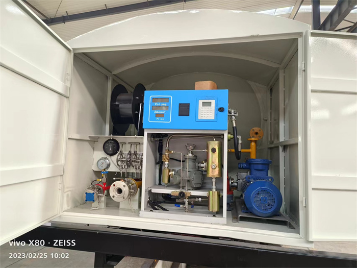 此外,根據(jù)用戶方便裝卸作業(yè)的要求,罐體尾部裝設(shè)有LPG泵、LPG加氣機、15米加氣軟管和自動回位卷盤。我公司根據(jù)多年生產(chǎn)和實際使用經(jīng)驗,優(yōu)化工藝管路,不僅安全可靠,實際使用中更高效、易操作、使用壽命長。