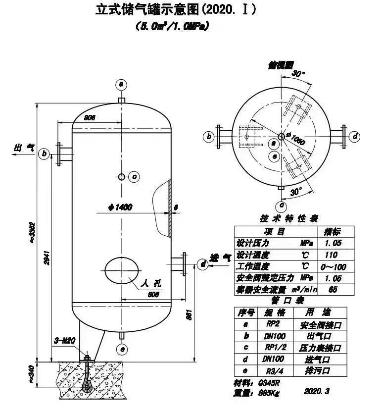 空氣儲(chǔ)罐多設(shè)計(jì)成立式結(jié)構(gòu),便于安裝使用,現(xiàn)介紹5立方立式空氣儲(chǔ)罐,它采用Q345R材質(zhì)制作,總重885kg,其它參數(shù)如下: