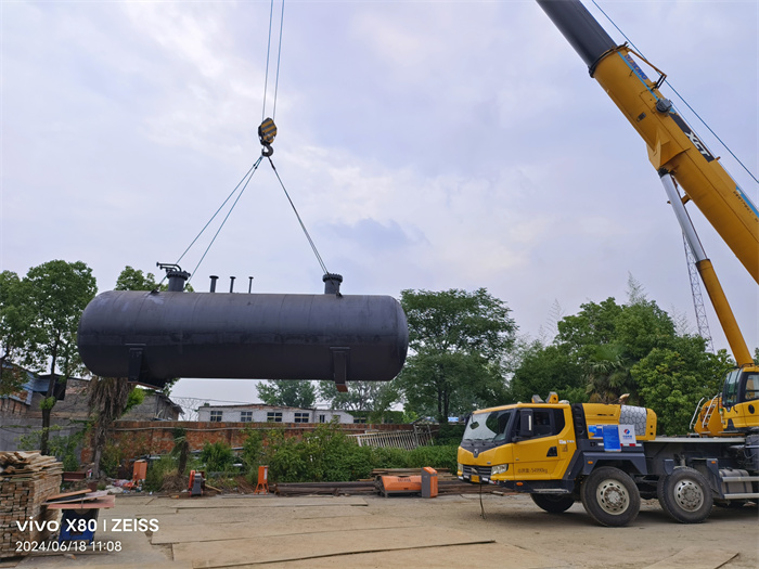 6月23日,我公司生產(chǎn)的4臺50立方液化氣地埋罐產(chǎn)品在襄陽一液化氣站內(nèi)順利吊裝就位,只見現(xiàn)場一臺大型110噸吊機熟練的將各個儲罐從平板運輸車上起吊并準(zhǔn)確的放置在地基下方的水泥墩上。