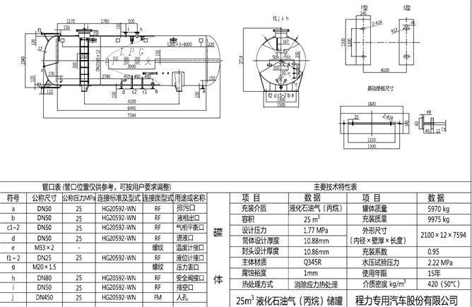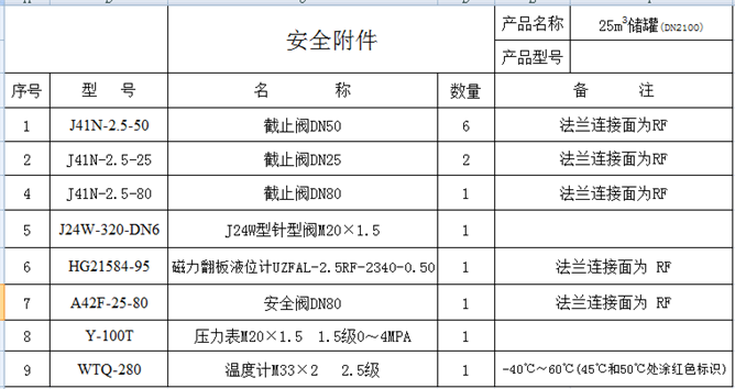 25立方液化氣儲罐是一種常見的規(guī)格型號,根據(jù)市場需求設(shè)計(jì)成直徑2100mm的居多,有的液化氣站用2個或者3個25立方的儲罐貯存LPG,經(jīng)濟(jì)實(shí)惠,管理也方便。以下為按直徑2100mm的配置制定的安全附件清單,供客戶們參考使用。